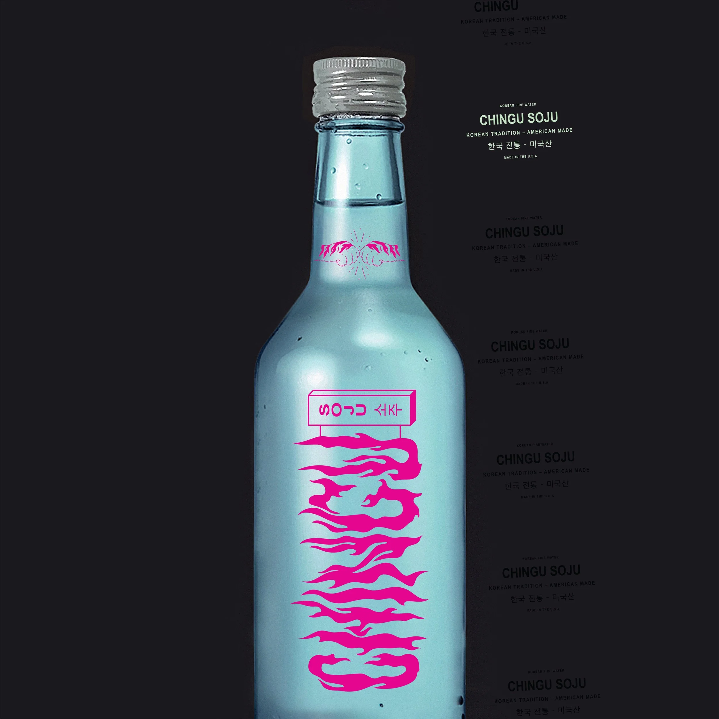 Clean fonts were chosen to balance out the fiery designs and colors. This balance emphasizes the relationship between expressive Korean traditions and the simple, non-elitist values of Chingu Soju. Even further, these fonts nod to many styles of Korean corner store signs.