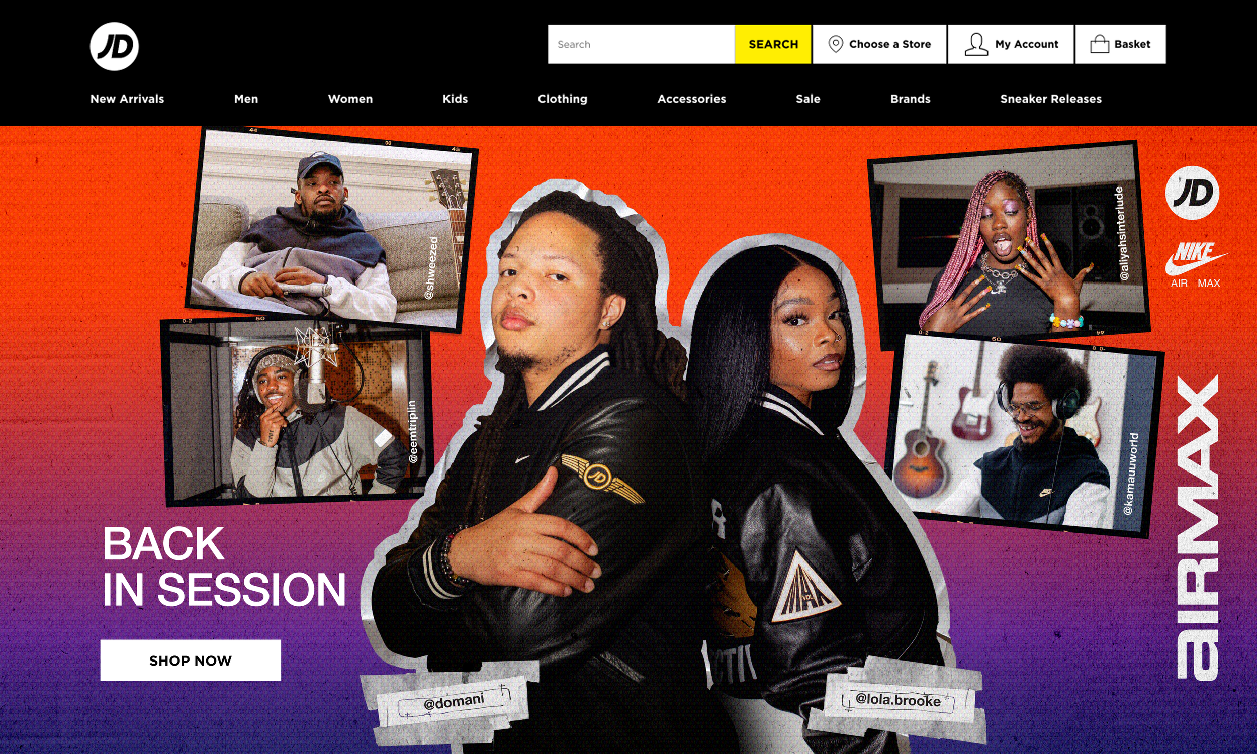 The Nike and JD Sports Global Air Collective is a subculture brand that we developed to co-create and bring together the best of two world-renowned brands while meeting consumers where they are. The Collective is a dynamic group of musicians who do more than influence. They challenge the status quo while connecting with and inspiring people through their art, and they’re able to act as cultural authenticators and tastemakers for JD Sports and Nike Air Max.